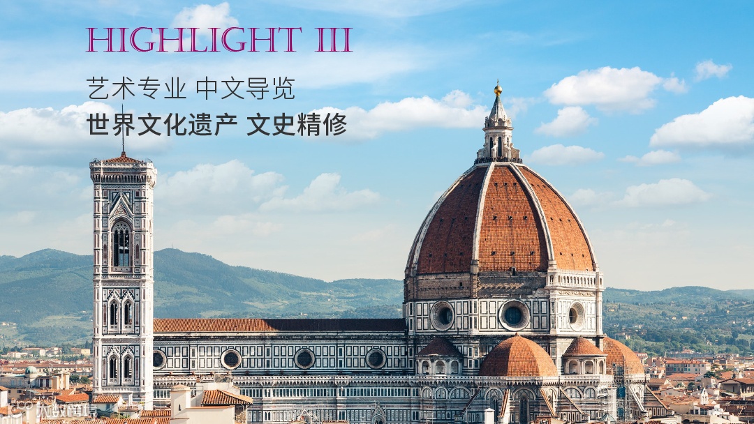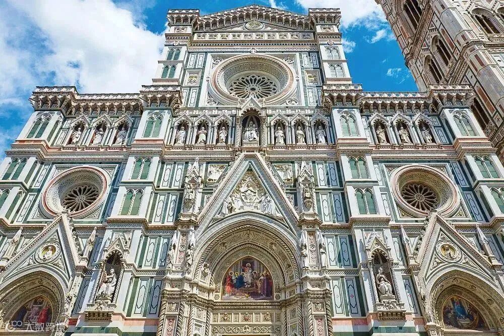 圣母百花大教堂位列“世界五大教堂”,前后耗时140年,内部修建补充扩建又延续数百年。佛罗伦萨在意大利语中意为“花之都”,译作花之圣母大教堂更为贴切一些。教堂建筑群由圣殿、洗礼堂以及乔托设计的钟塔构成。从此,欧洲建筑正式从"哥特时代"进入"文艺复兴时代"。