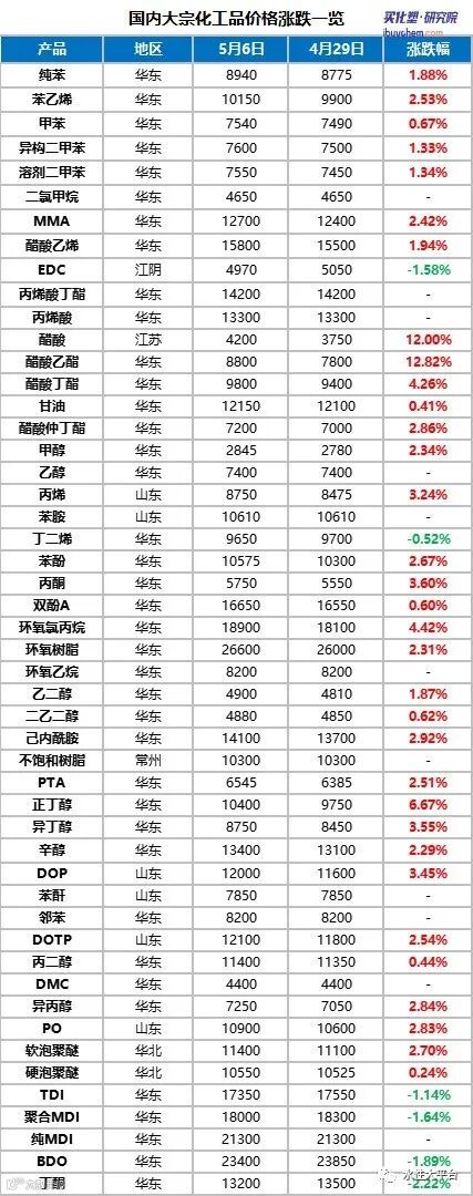 涨幅前三产品分别为醋酸乙酯↑12.82%、醋酸↑12.00%、正丁醇↑6.67%;跌幅前三产品分别为丁酮↓-2.22%、BDO↓-1.89%、聚合MDI↓-1.64%。