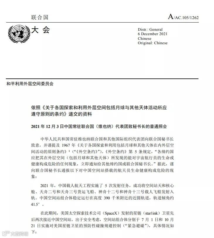 联合国和平利用外层空间委员会官网显示,2021年12月3日,中国常驻联合国(维也纳)代表团提交了致秘书长的普通照会,照会指出,美国太空探索技术公司(SpaceX)发射的“星链”(starlink)卫星今年先后两次接近中国空间站。出于安全考虑,中国空间站组合体分别于7月和10月两次实施对美国“星链”卫星的预防性碰撞规避控制(“紧急避碰”)。