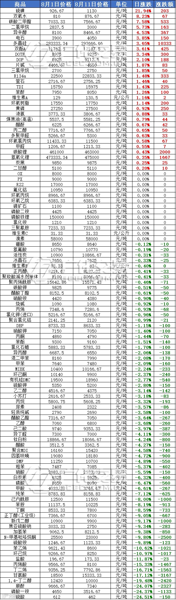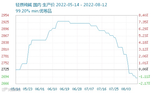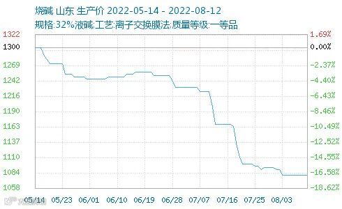 截止8月11日,烧碱市场基准价为1080元/吨,同比7月下跌了118元/吨,跌幅将近10%。