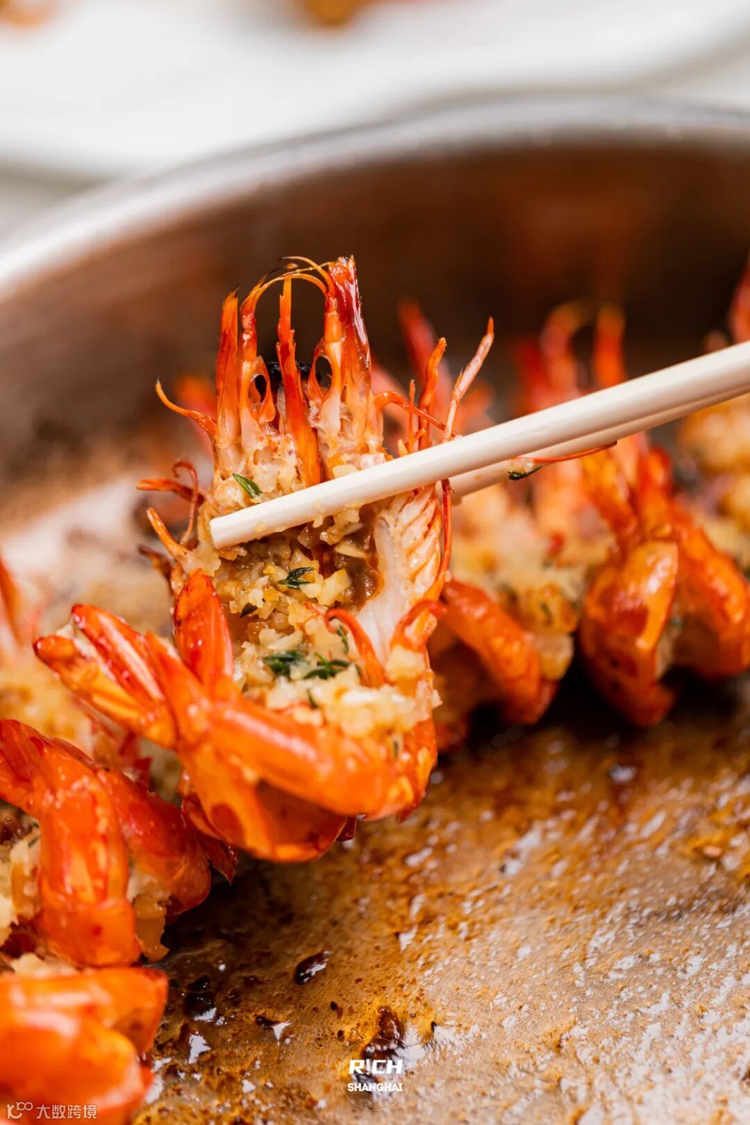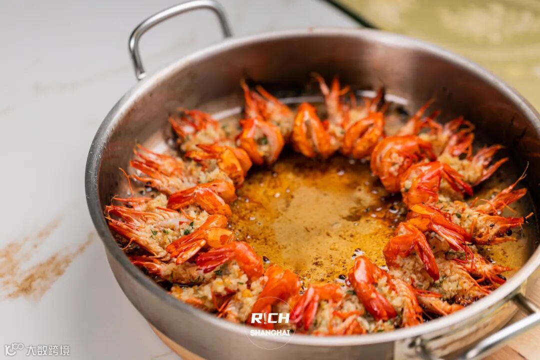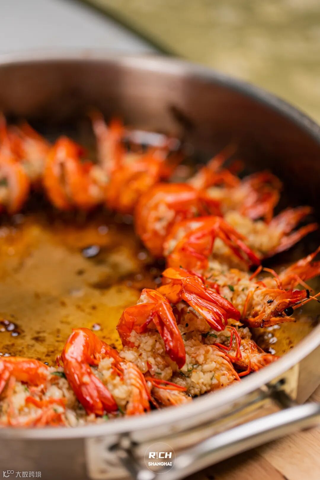 鲜虾作为大海馈赠的美味,惠食佳·朱雀妙用巧思,先经过精湛的刀工处理,将每只虾剖开成两半,再采用宽而平的铁盘烹制红虾。