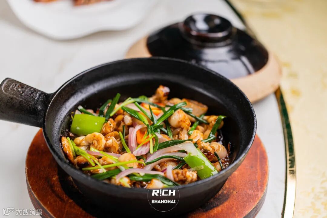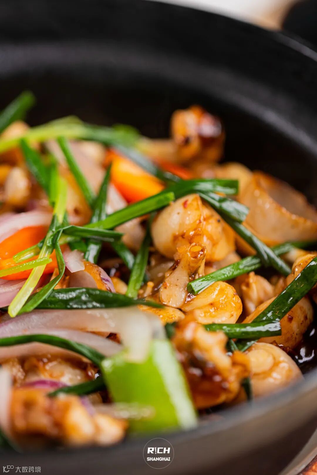 再配以葱姜蒜和酱汁爆香,鲜艳的配菜与淡黄色的牛蛙相互映衬,散发出馥郁香气;蛙肉更是细腻Q弹,爽脆可口,瞬间食欲大增。
