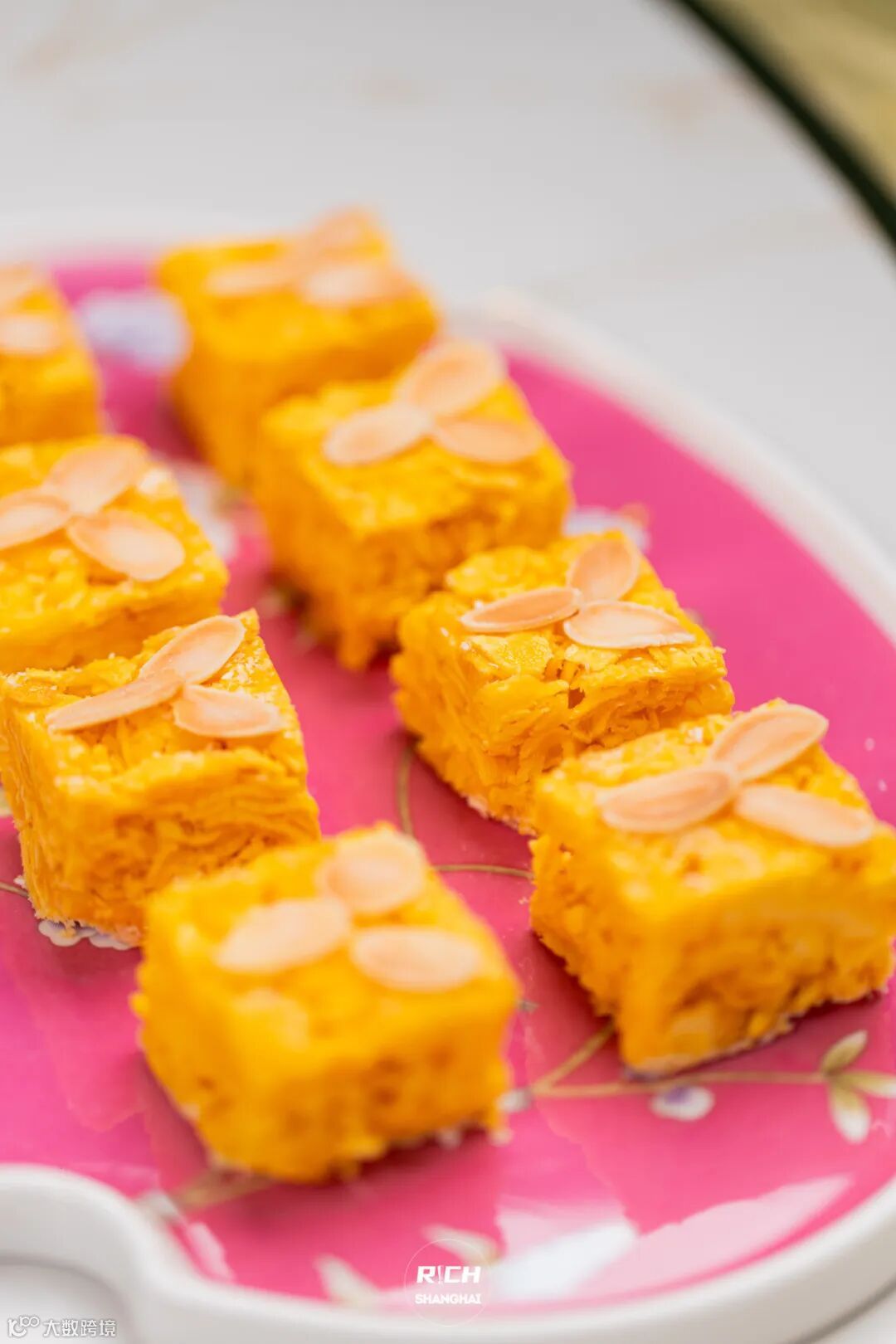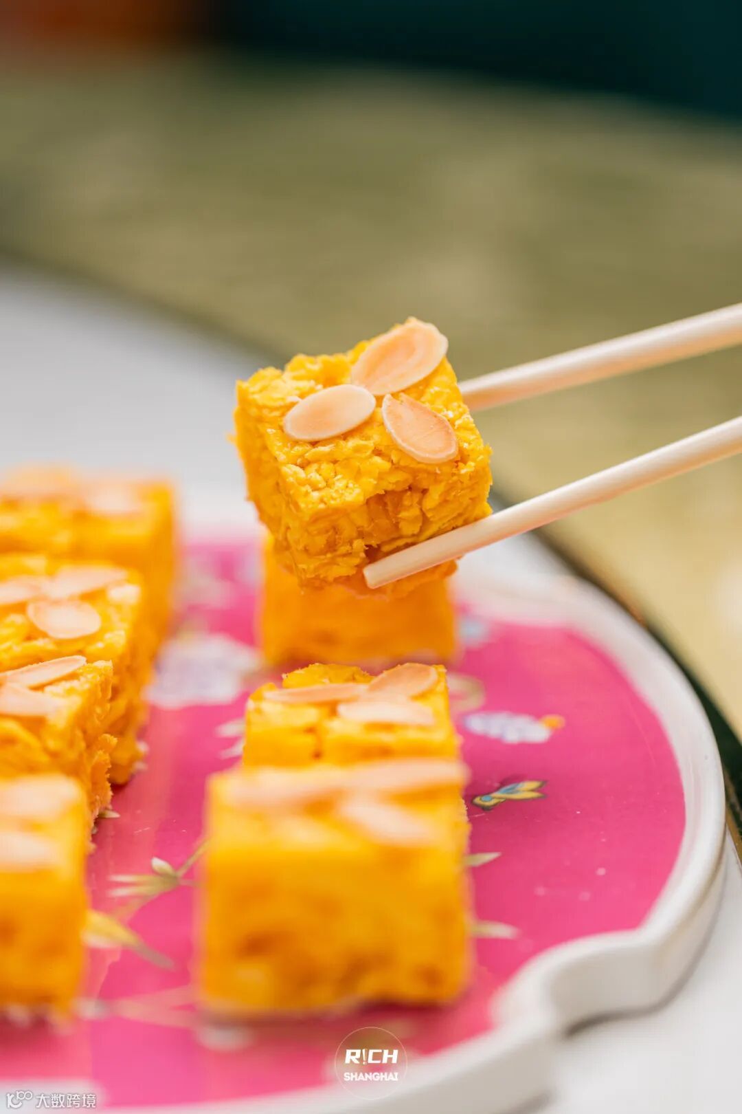 饭后点心当然少不了这道「朱雀新马仔」,沙琪玛与杏仁的组合让其外观精美,色彩鲜艳,浅尝一口更是细腻绵软,带给唇齿间满满留恋。