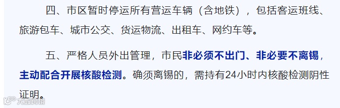 五、严格人员外出管理,市民非必须不出门、非必要不离锡,主动配合开展核酸检测。确须离锡的,需持有24小时内核酸检测阴性证明。