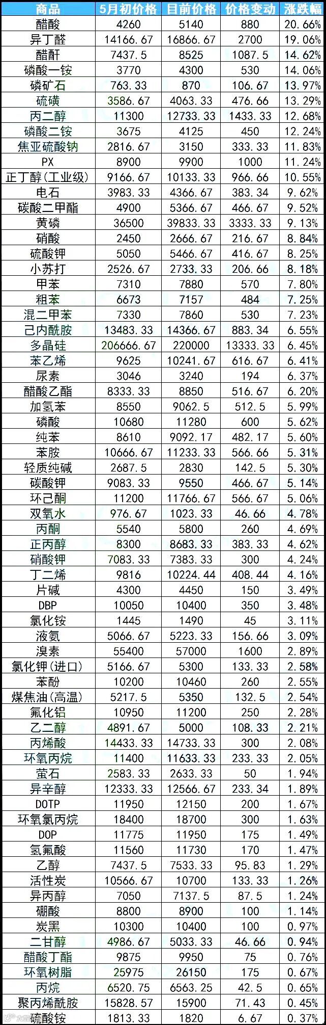 部分化工原材料月初以来涨价情况