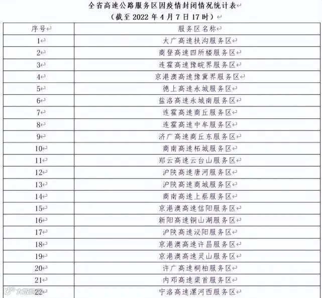 4月8日,记者从河南高速公路相关部门获悉,根据当地疫情防控指挥部要求,大广高速扶沟服务区、连霍高速商丘服务区、京港澳高速信阳服务区等河南37个高速服务区封闭,禁止车辆驶入。