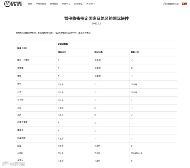 另外,受当地交通管制等影响,顺丰自3月6日起就已暂停收寄俄罗斯、乌克兰、柬埔寨、智利、文莱等多个国家及地区的国际快件。