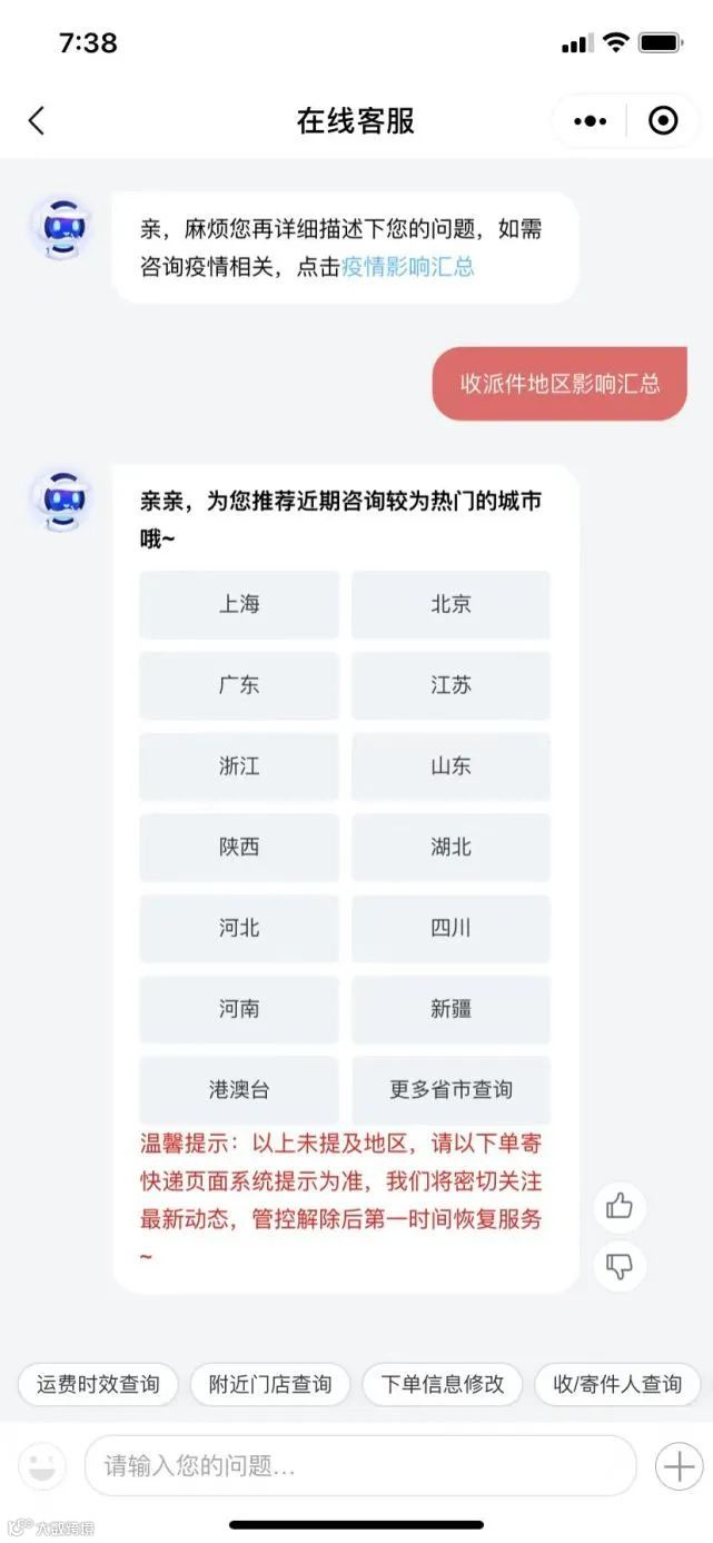 记者从顺丰了解到,上海、北京、广东、江苏、浙江、山东、陕西、河北、四川、河南等全国十几个省市地区受疫情影响,快递网点暂停收派件服务。