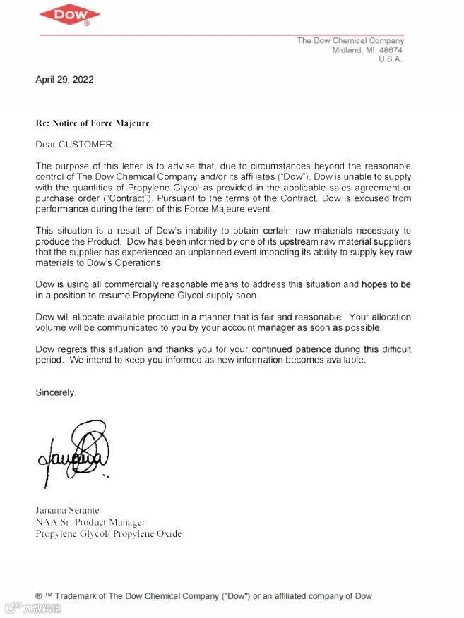 近日,陶氏也发布紧急通知称,受上游原材料的一家供应商意外事故影响,中断了其向陶氏业务供应关键原材料的能力,因此,陶氏宣布丙二醇遭遇不可抗力而停供,恢复时间后续通知。