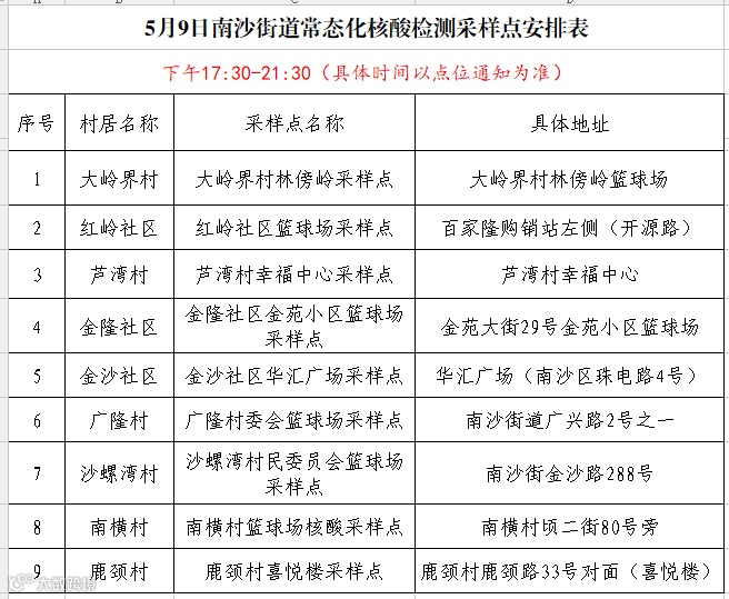 为进一步强化南沙街道新冠肺炎疫情防控能力,贯彻落实“外防输入、内防反弹”的防控总策略,进一步发挥常态化核酸筛查的“哨点”作用,做好南沙街道五一节后常态化核酸检测工作,现决定于5月9日(周一)17:30-21:30分别在大岭界村(大岭界村林傍岭篮球场)、红岭社区(红岭社区篮球场)、芦湾村(芦湾村幸福中心)、金隆社区(金苑小区篮球场)、金沙社区(华汇广场)、广隆村(广隆村委篮球场)、沙螺湾村(沙螺湾村委篮球场)、南横村(南横村篮球场)、鹿颈村(鹿颈村喜悦楼)开展常态化核酸检测。请以上9个村(居)的群众在规定时间内有序前往核酸检测采样点采样。