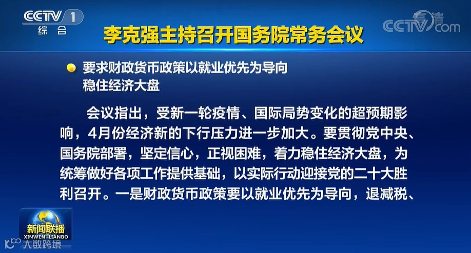 近日,国务院总理李克强主持召开国务院常务会议,要求财政货币政策以就业优先为导向,稳住经济大盘。要确保粮食产量和供应稳定,夯实稳物价基础。按市场化法治化原则,通过发行不动产投资信托基金等方式,盘活基础设施等存量资产,以拓宽社会投资渠道和扩大有效投资、降低政府债务风险。指导地方拿出有吸引力项目示范,对参与投资的各类市场主体一视同仁。在前期支持基础上,再向中央发电企业拨付500亿元可再生能源补贴,通过国有资本经营预算注资100亿元,支持煤电企业纾困和多发电。要优化政策,安全有序释放先进煤炭产能。决不允许出现拉闸限电。