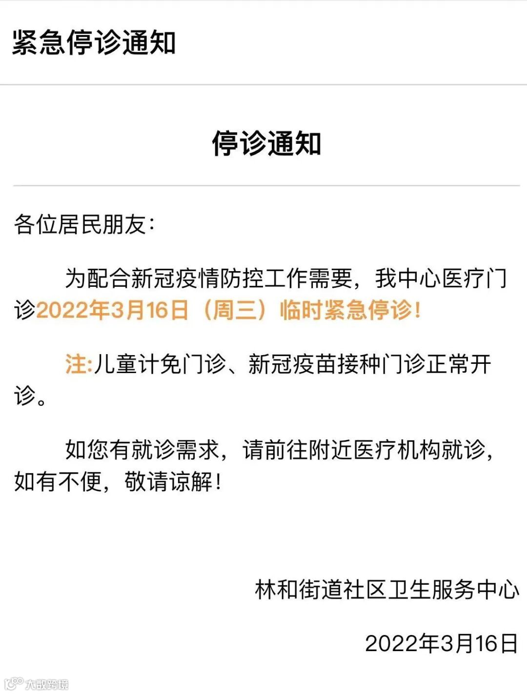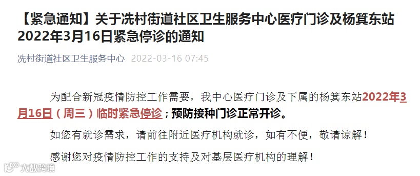 林和街道社区卫生服务中心通知:为配合新冠肺炎疫情防控工作需要,该中心医疗门诊2022年3月16日(周三)临时紧急停诊。
