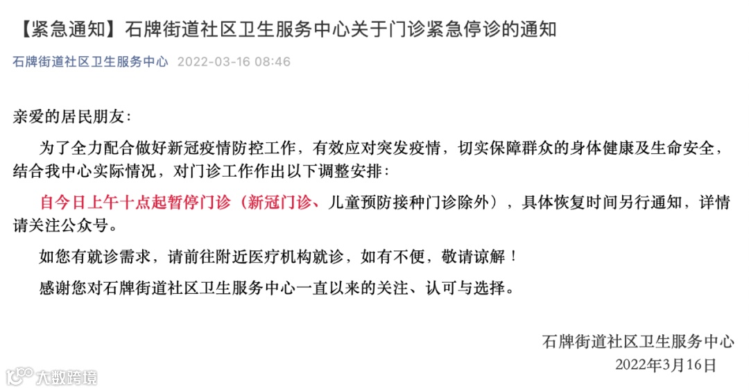 自今日上午十点起暂停门诊(新冠门诊、儿童预防接种门诊除外),具体恢复时间另行通知。
