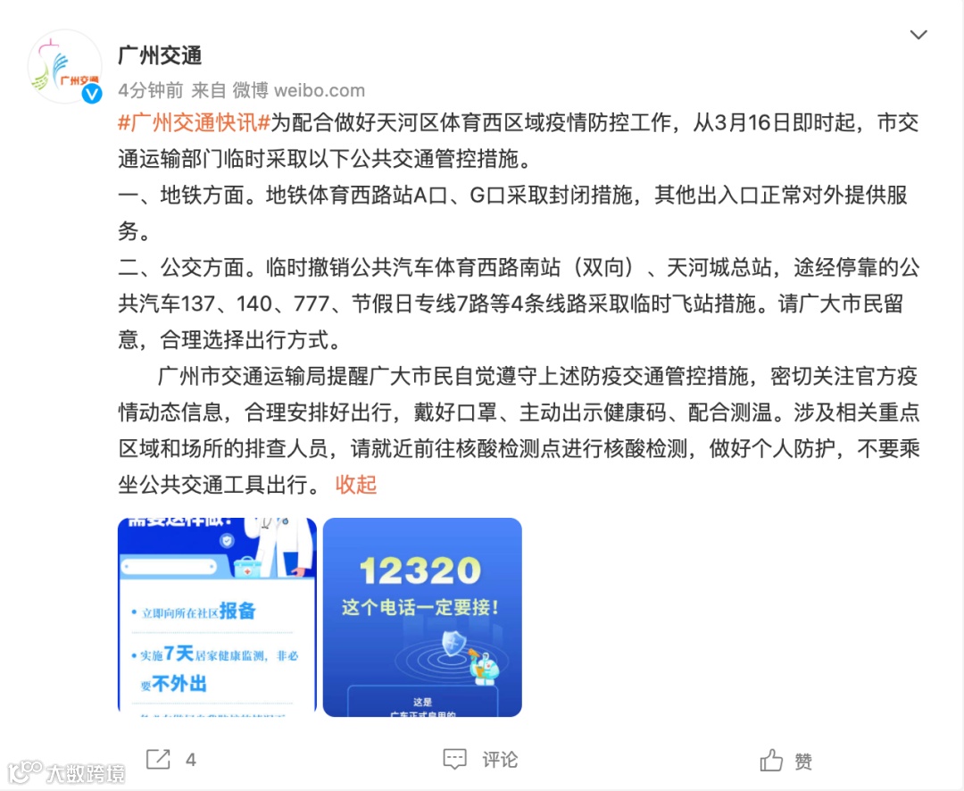 3月16日上午,广州市交通运输局发布消息,为配合做好天河区体育西区域、黄埔区云埔街区域疫情防控工作,从3月16日即时起,市交通运输部门临时采取公共交通管控措施。包括地铁体育西路站A口、G口采取封闭措施,临时撤销多个公交站点等。