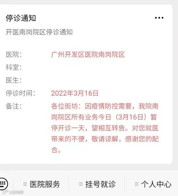 16日上午,广州开发区医院南岗院区发布了停诊通知:因疫情防控需要,我院南岗院区所有业务今日 (3月16日)暂停开诊一天。