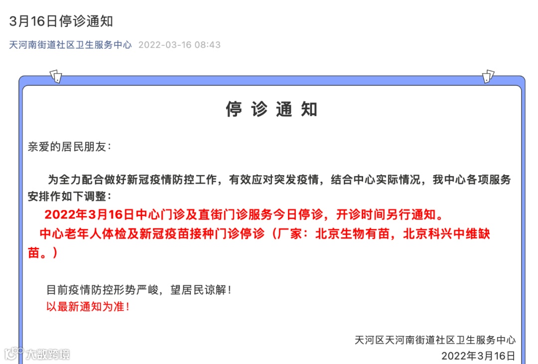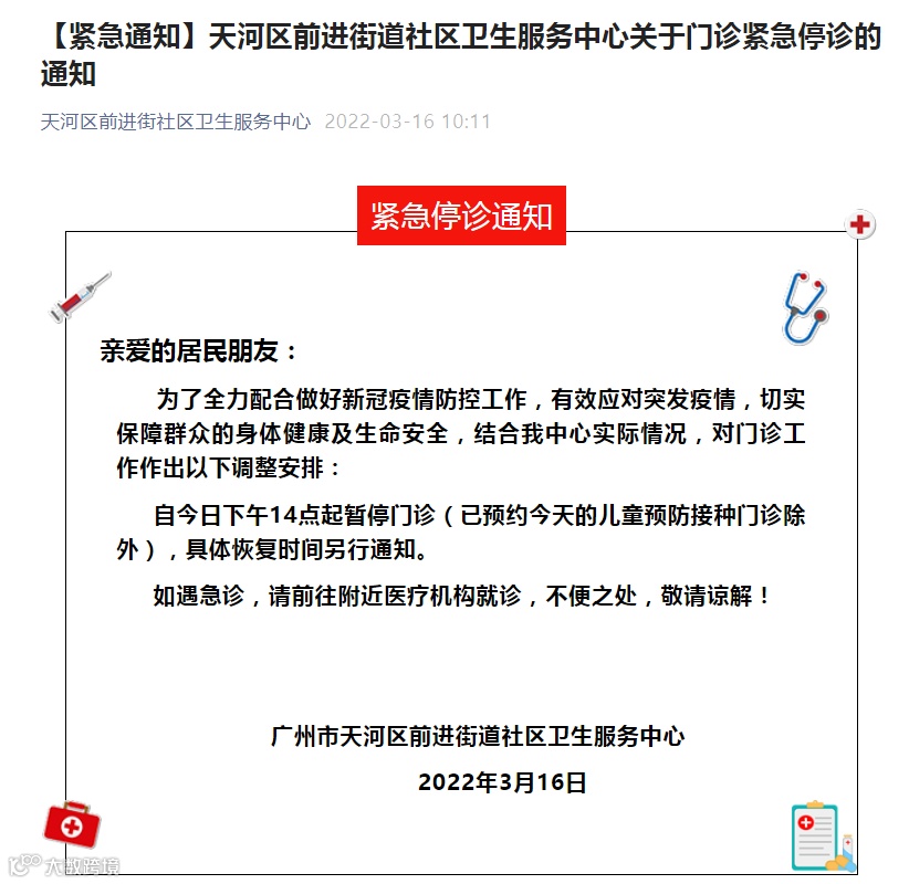 同时,天河区、黄埔区多家社区卫生服务中心及医院发出紧急停诊的通知。