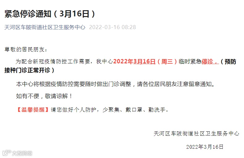 天河区车陂街道社区卫生服务中心通知,16日临时紧急停诊,(预防接种门诊正常开诊)。