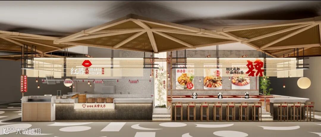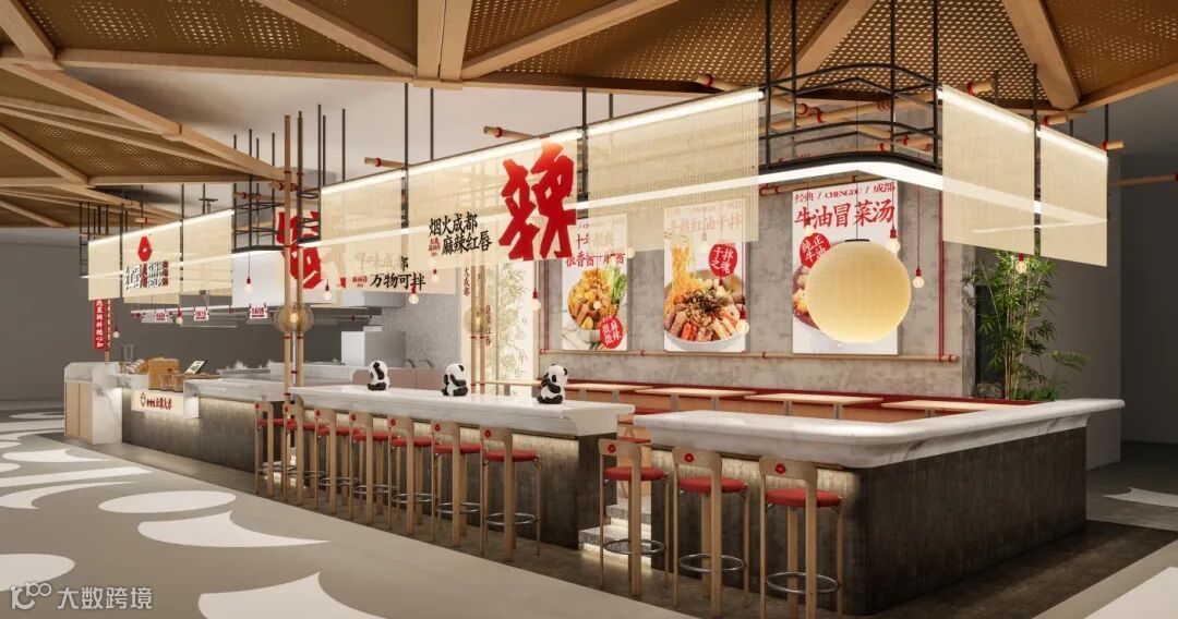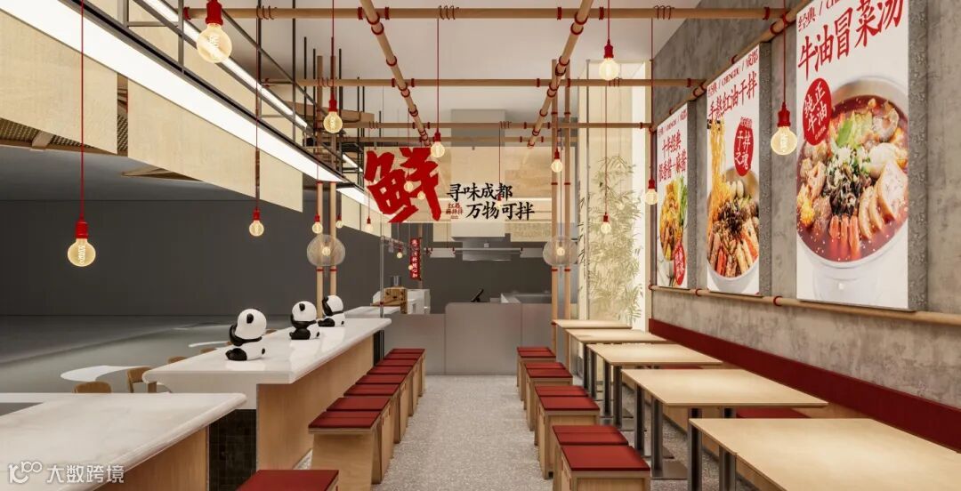 充满烟火气的成都市井风复古装修,熊猫,竹子,麻布等元素,整体店面质感满满。