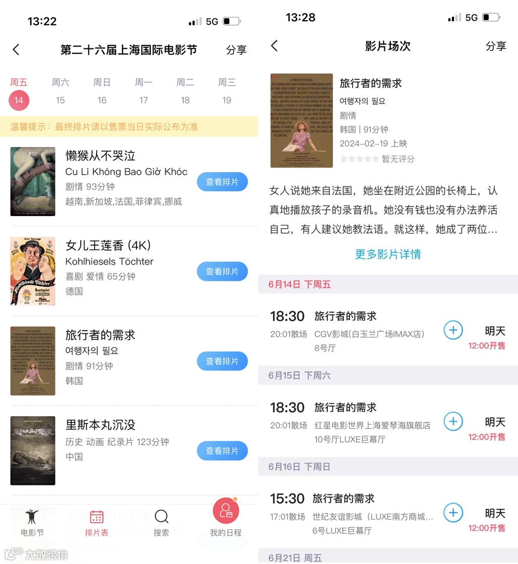 3. 待开售后,您可在「排片表」中购买,也可在已添加的「我的日程」里抢票。