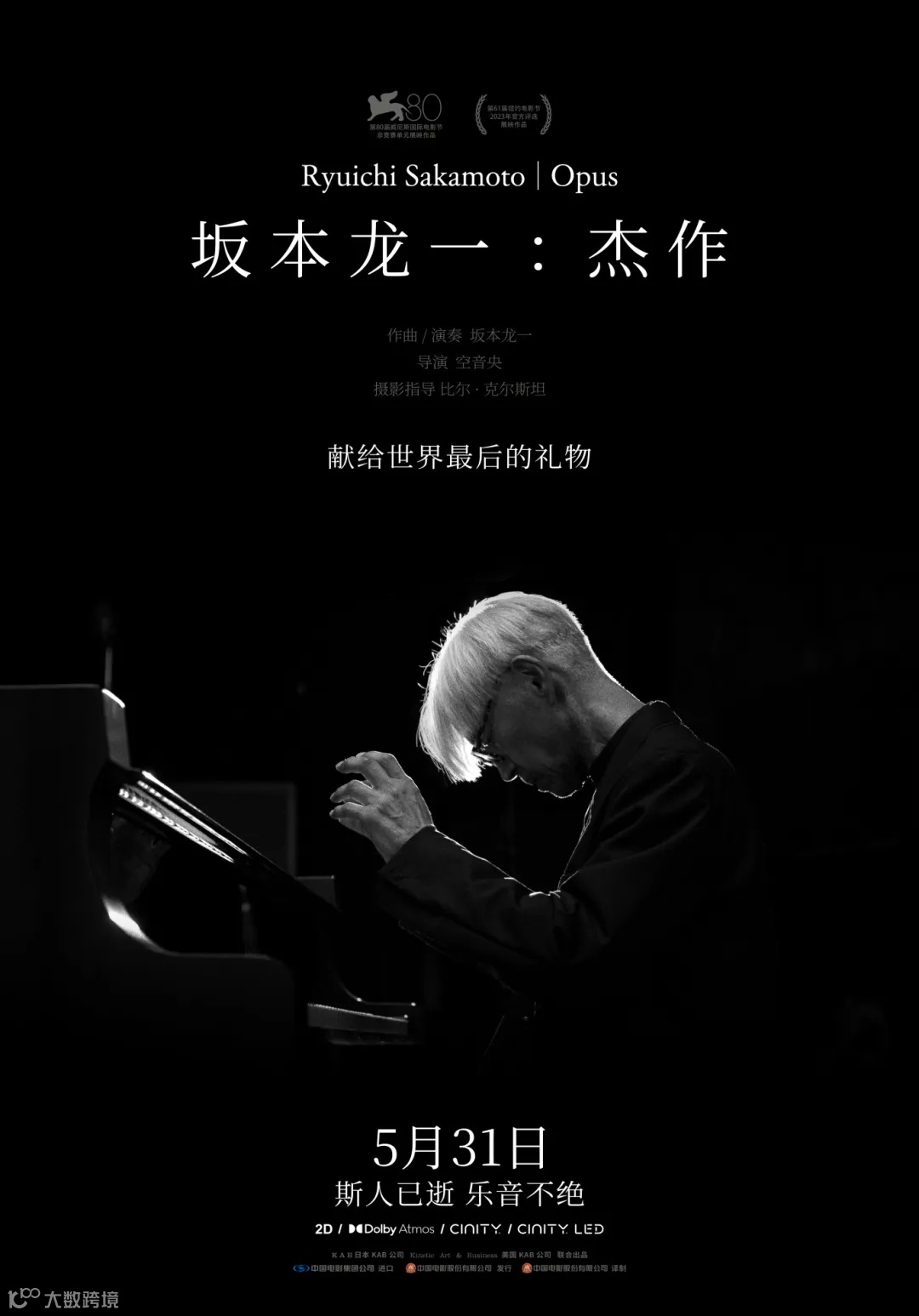由日本KAB公司、美国KAB公司联合出品,中国电影集团公司进口、中国电影股份有限公司发行、译制的豆瓣9.5分口碑佳作《坂本龙一:杰作》宣布定档5月31日上映,并发布定档海报。2024年3月28日,是日本著名作曲家、音乐制作人、歌手、演员、钢琴家坂本龙一先生逝世一周年忌日。为了深切缅怀和纪念这位世界级艺术家的传奇音乐生涯,导演空音央也是坂本龙一的儿子,记录了其父亲生前的最后一场钢琴独奏音乐会,作为坂本龙一献给世界最后的礼物。其中包括《圣诞快乐,劳伦斯先生》《末代皇帝》《水》等在内的二十首经典曲目,也是我们和他最郑重的告别。影片在北影节展映时就曾收获很高的热度与口碑,音乐流淌,重现生命乐章,斯人已逝,乐音不绝。电影将提供2D、CINITY、CINITY LED版本及杜比全景声版本供观众选择,届时将带给观众一场高品质的视听盛宴!影片将于5月31日全国上映,一起走进电影院享受103分钟的纯享音乐会,好好和教授告别!