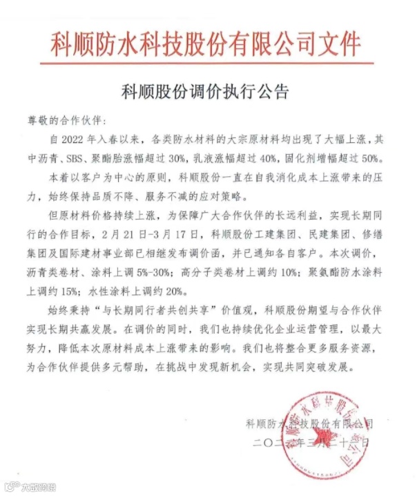 就在3月22日,根据科顺股份官微消息,公司3月21日发布调价执行公告:因原材料价格持续上涨,为保障广大合作伙伴的长远利益,实现长期同行的合作目标,2月21日-3月17日,科顺股份工建集团、民建集团、修缮集团及国际建材事业部已相继发布调价函,并已通知各自客户。本次调价,沥青类卷材、涂料上调5%-30%;高分子类卷材上调约10%;聚氨酯防水涂料上调约15%:水性涂料上调约20%。