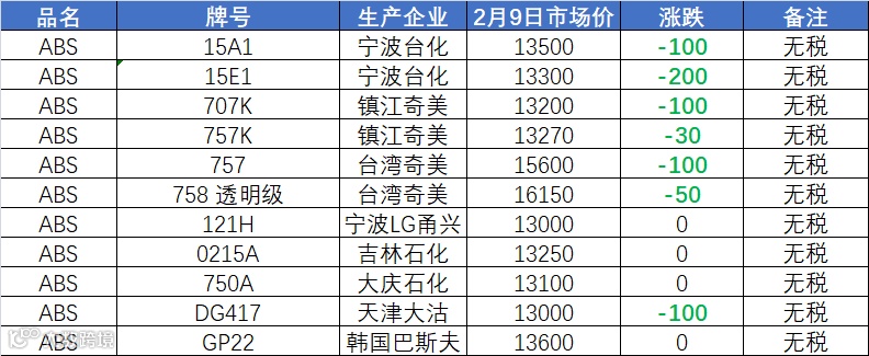 ABS市场价格方面也是由涨转跌的走势,ABS/宁波台化/15A1跌100元/吨,ABS/宁波台化/15E1跌200元/吨,去年别的塑料都在涨的时候,它再跌,今年大家开始跌的时候,它跟着跌,不得不说,高位囤ABS料的老板还是挺艰难的。