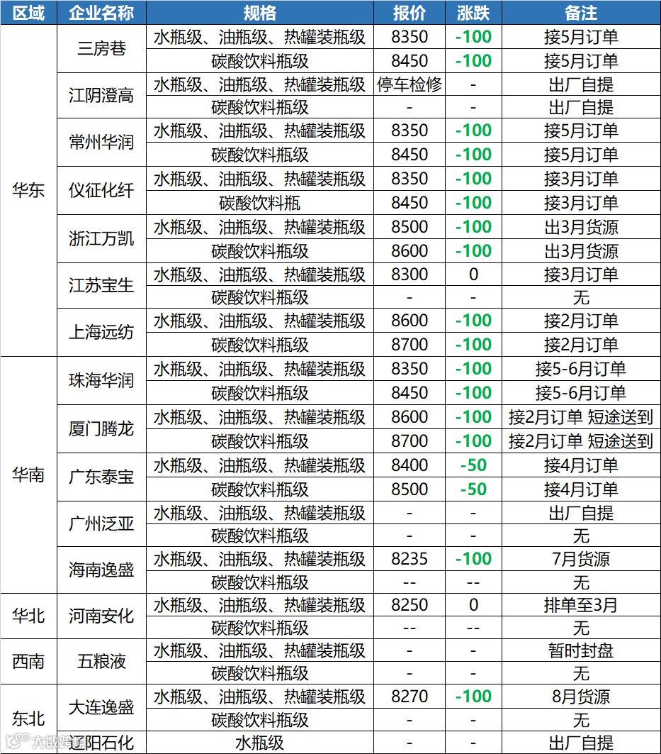 聚酯双原料价格宽幅下跌,成本端坍塌,下游业者悲观心态增加,低价资源流出,市场重心明显下移。市场观望情绪浓厚,市场交投氛围欠佳。今日华东、华南多数瓶片厂家整体下调100元/吨;