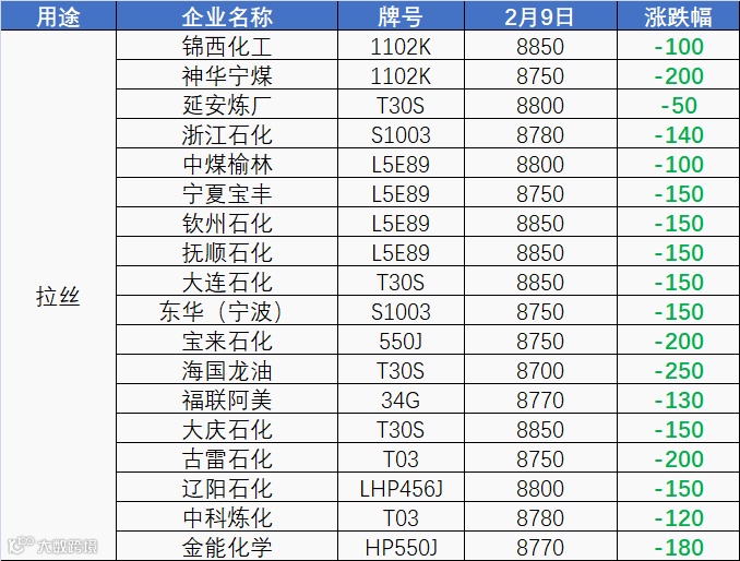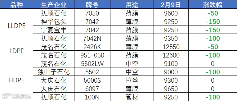 2月9日,PE东莞市场价格呈现下跌趋势,幅度在50-150元/吨,今日期货开盘下跌为主,市场报价多数随行就市调整,成交氛围偏弱,预计短期PE市场价格下跌为主。