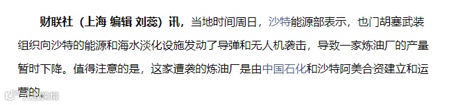 据财联社报道,当地时间周日,沙特能源部表示,也门胡塞武装组织向沙特的能源和海水淡化设施发动了导弹和无人机袭击,导致一家炼油厂的产量暂时下降。值得注意的是,这家遭袭的炼油厂是由中国石化和沙特阿美合资建立和运营的。