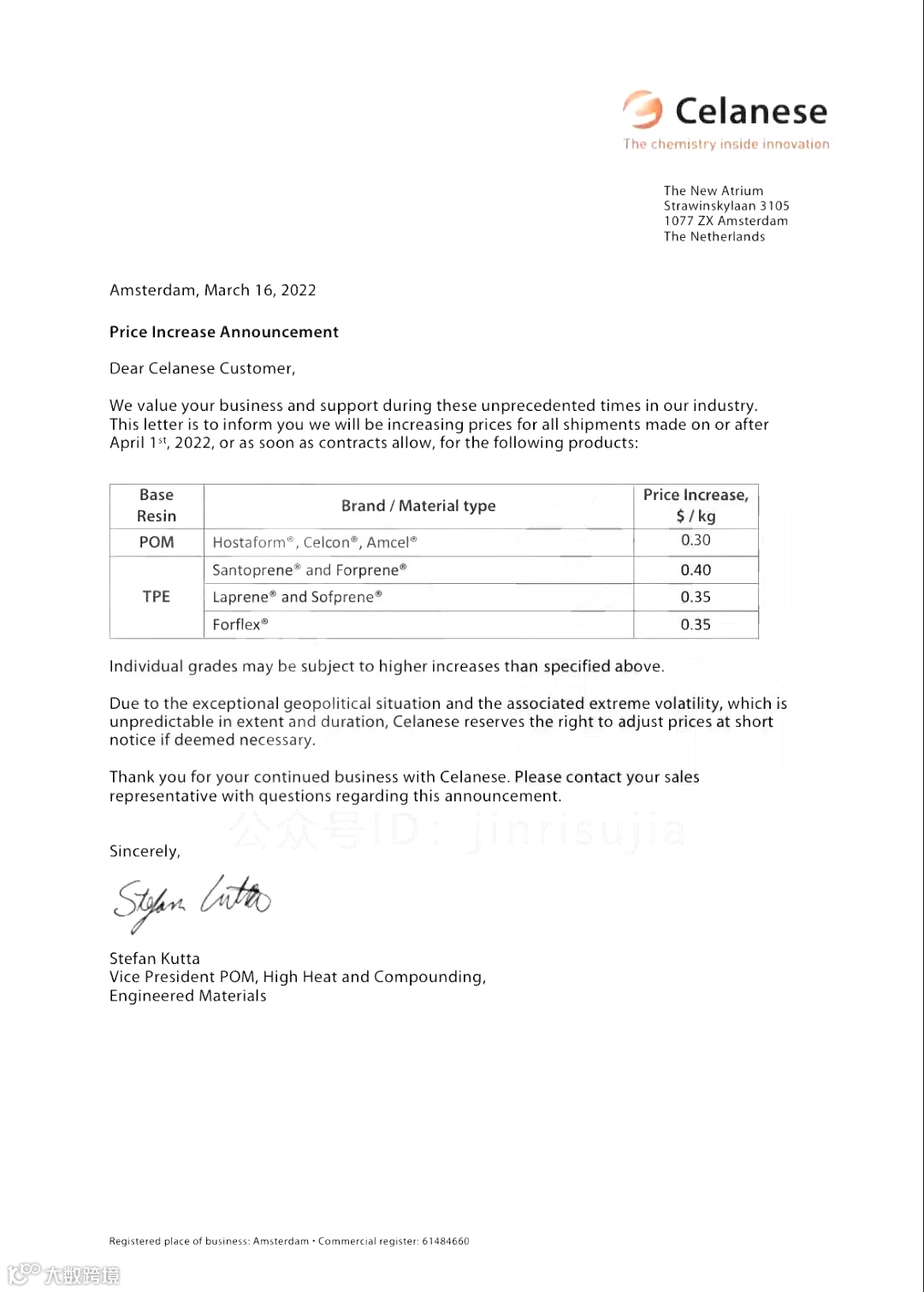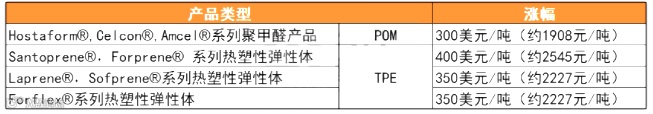 3月16日,塞拉尼斯发布调价通知函称,将从4月1日起,提高公司部分系列POM(聚甲醛)、TPE(热塑性弹性体)价格,最高涨幅高达400美元/吨!
