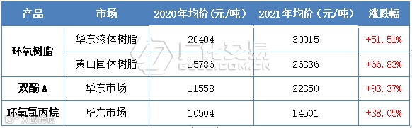 2021年,环氧树脂产业链可谓是经历了“不平凡”的一年,无论是双原料还是树脂,其产品年均价较2020年均有显著拔高。