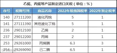 2022年1月1日起,我国将对954项商品实施低于最惠国税率的进口暂定税率。其中针对液化丙烷、液化丁烷、乙烯、丙烯、丙烯腈、己二腈等,可以看到2022年暂定进口税率均大幅低于最惠国税率,除丙烯腈进口税率调至3%以外,其他5大类产品税率均调至1%。
