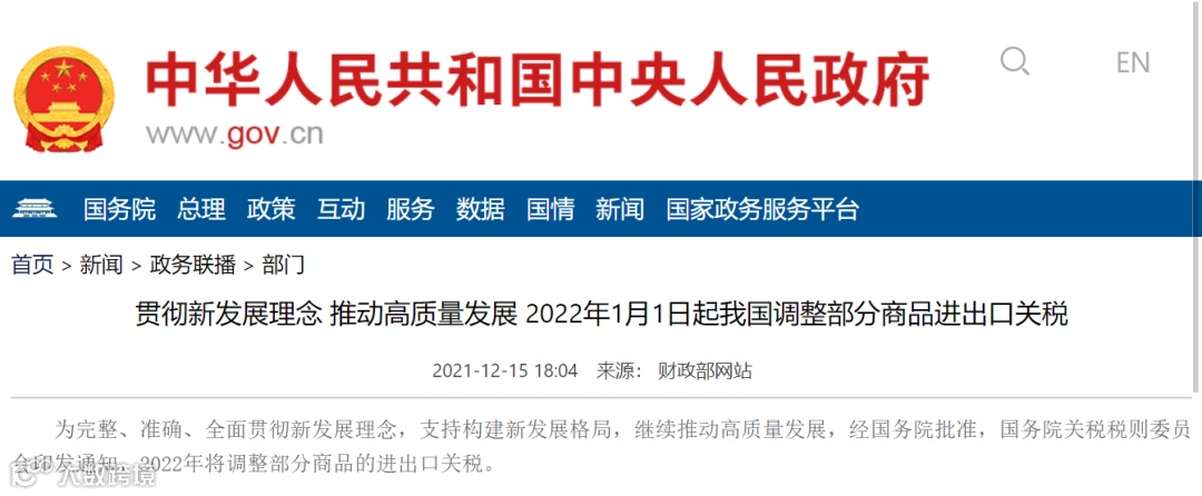 12月15日,经国务院批准,国务院关税税则委员会印发通知,2022年将调整部分商品的进出口关税。