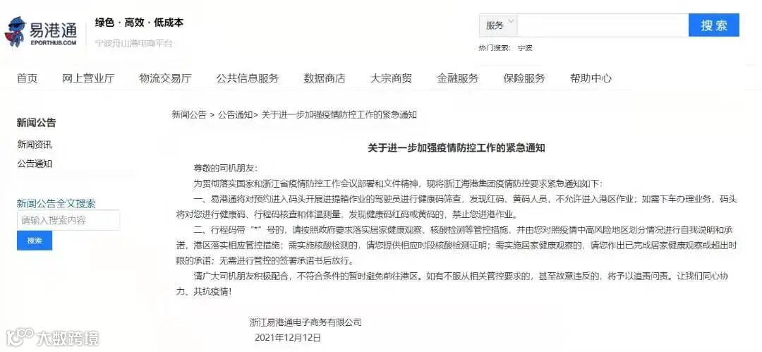 12月12日,受疫情升级影响,宁波舟山港发布了关于进一步加强疫情防控工作的紧急通知,将对预约进入码头开展进提箱作业的驾驶员进行健康码筛查。“在保证疫情有效防控的前提下,我们坚信保障生产和阻击疫情可以同步进行。”