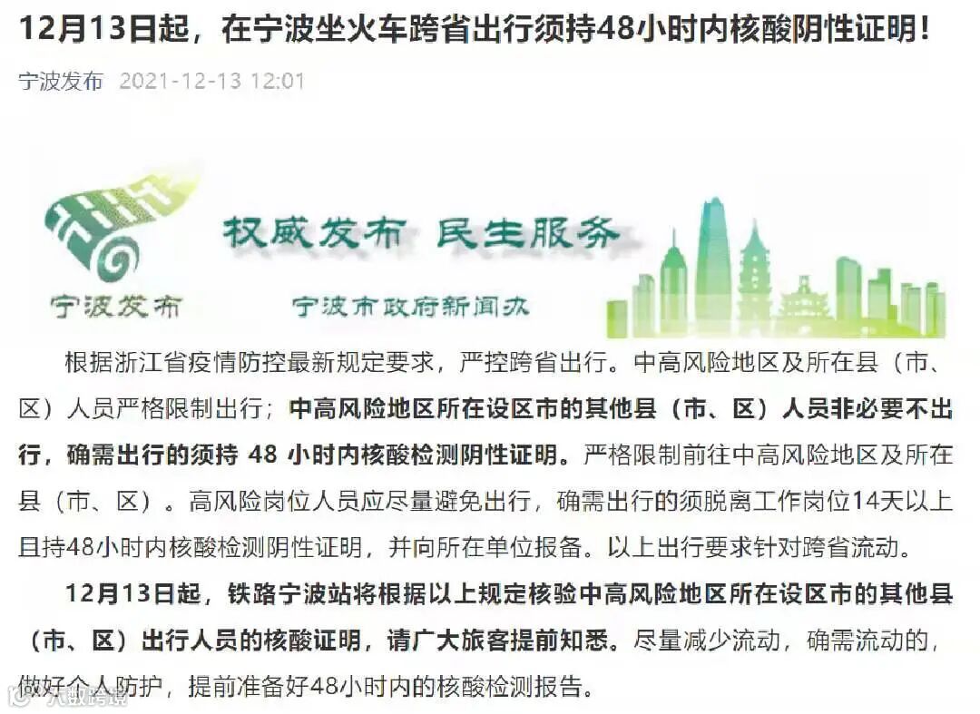 12月13日起,铁路宁波站将根据以上规定核验中高风险地区所在设区市的其他县(市、区)出行人员的核酸证明,请广大旅客提前知悉。尽量减少流动,确需流动的,做好个人防护,提前准备好48小时内的核酸检测报告。要求执行时间将一直延续到2022年3月15日。