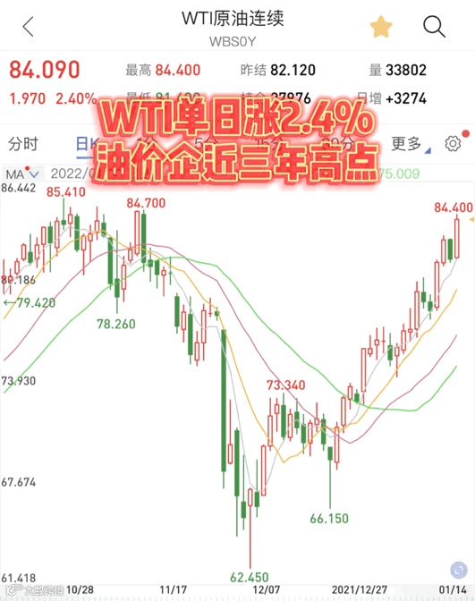 另外一边,WTI原油单日上涨2.4%,14日收盘报84.09美元/桶,回顾2021年美油走势,整体以上涨为主,全年录得55.82%的涨幅,2022年刚开始,油价已经企近近三年高点。