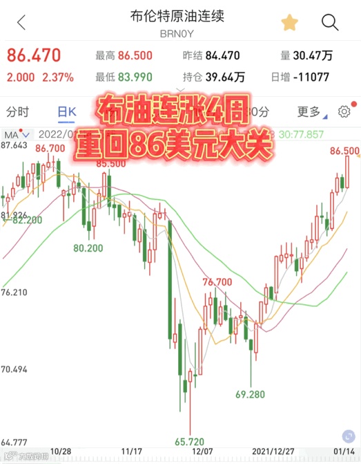 国际原油近期涨势强劲,布伦特原油连涨4周,单日创下2.37%的涨幅,14日收盘报86.47美元/桶,为2014年10月以来最高收盘价。