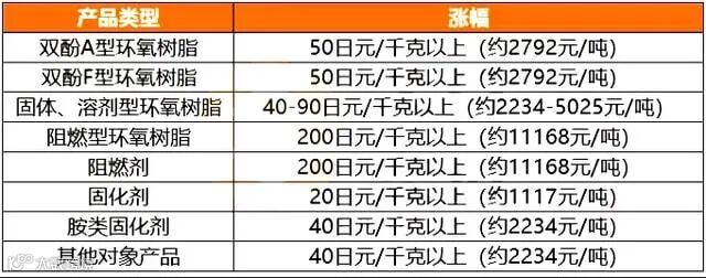 DIC株式会社决定2022年1月17日起将电子部件的绝缘材料、粘合剂、涂料等使用的环氧树脂及环氧树脂固化剂产品的价格进行调整,其中涨幅最大产品为阻燃/难燃型环氧树脂,价格上调200日元/千克以上(约11148元/吨)。