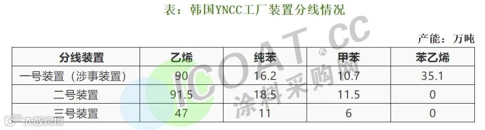 位于韩国丽水的YNCC工厂遭遇断电事故,1号线非计划停车。涉事的1号装置乙烯涉及产能90万吨,纯苯涉及产能16.2万吨,并配套下游苯乙烯35.1万吨。而在此前不久,该厂3号装置因爆炸事故停车,47万吨乙烯、24万吨丙烯及11万吨纯苯停产;