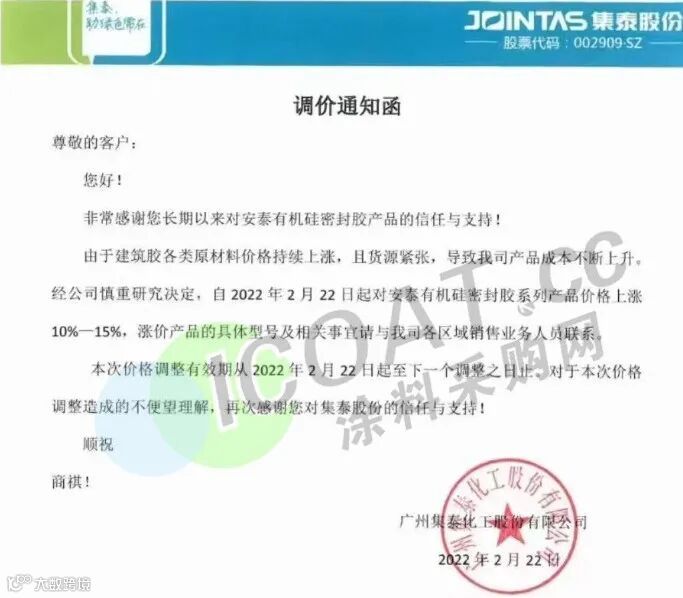 近日,集泰股份发布调价通知函,由于建筑胶各类原材料价格持续上涨且货源紧张,导致产品成本不断上升。经慎重研究决定,自2022年2月22日起对安基有机硅森封胶系列产品价格上涨10%一15%。