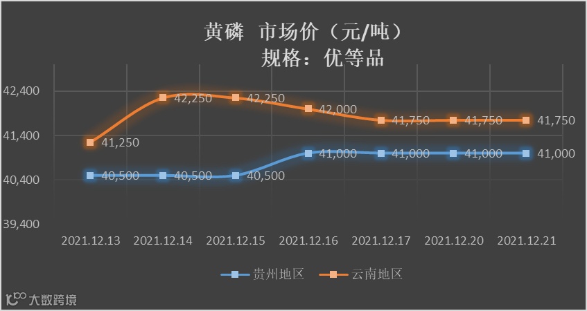 12月21日,贵州地区与云南地区的黄磷市场均价分别为41,000元/吨与41,750元/吨。今日贵州部分企业维持低负荷生产,报价与昨日持平,企业净磷承兑新单报价44,000元/吨。其中贵州黔能天和磷业黄磷装置负荷不高,企业黄磷基本无库存;云南澄江志成黄磷装置开机,黄磷库存偏紧,净磷承兑新单暂不报价;贵州开阳磷化工黄磷装置开机,企业黄磷基本无库存,黄磷企业自用为主,后续情况有待持续跟进关注。