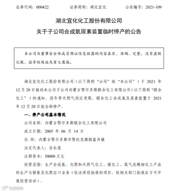 12月20日,湖北宜化晚间公告,公司于2021年12月20日接到本公司子公司内蒙古鄂尔多斯联合化工有限公司(以下简称“联合化工”)的通知,因冬季天然气供应受限,联合化工合成氨及尿素装置于2021年12月20日起全部停产。