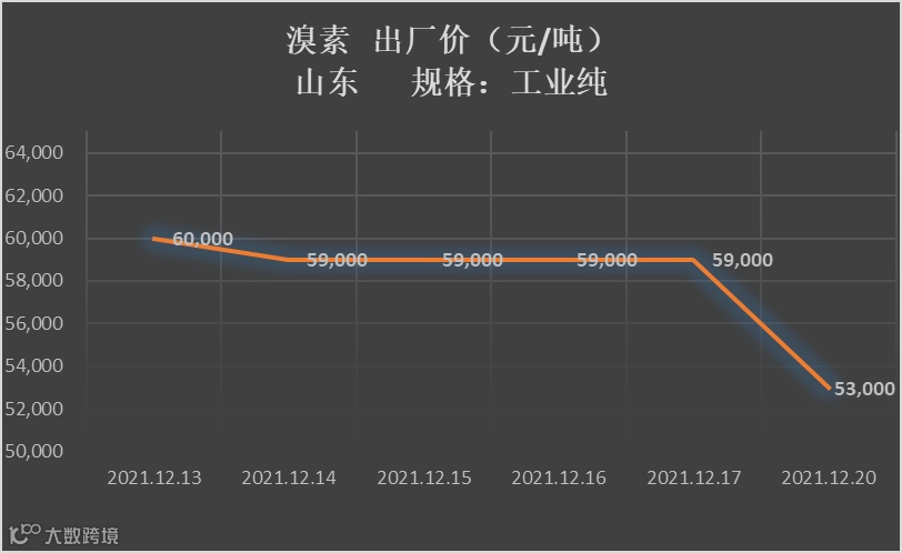 12月21日,溴素市场价格弱势运行,厂家出货一般,其中寿光紫旭化工溴素现报价在54,000元/吨左右。主力下游阻燃剂、中间体行业由于受到国内疫情影响导致工厂开工率整体不高,且多有溴素库存,下游需求整体疲软以刚需采购为主。