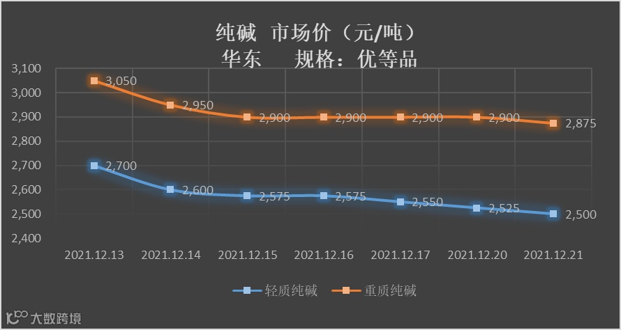 12月21日,国内纯碱市场成交重心仍有下移,其中华东地区轻质纯碱和重质纯碱的市场均价分别为2,500元/吨与2,875元/吨。