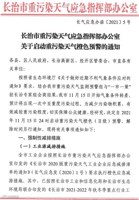 11月14日,长治市重污染天气应急指挥部办公室发布《关于启动重污染天气橙色预警的通知》,自2021年11月15日24时起,全市工业企业按照长治市重污染天气应急指挥部办公室印发的《长治市 2020 版重污染天气工业企业应急减排清单的通知》(长气应急发[2020]1号)要求执行橙色应急减排措施。其中,已按照长治市工业和信息化局和长治市生态环境局联合印发的《长治市 2021-2022 年秋冬季重点行业工业企业错峰生产工作方案》(长工信运行节能[2021]202号)要求实施错峰停产的企业要继续保持停产状态,错峰生产要求和橙色预警要求不同的企业,要按更严格的要求执行。各县区有更严格要求的,按照县区规定执行。同时,各企业要提前做好检修工作,尽量避免生产设施在重污染天气应急响应期间频繁启停(保障安全生产除外)。