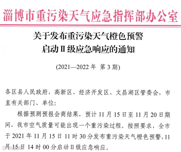 淄博市重污染天气应急指挥部办公室发布《关于发布重污染天气橙包预警启动Ⅱ级应急响应的通知》,全市于2021年11月15日11时30分发布重污染天气橙色预警,11月15日14时00分启动II级应急响应。