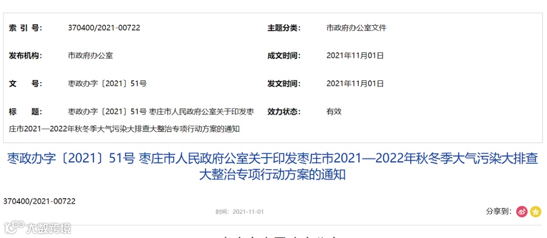 枣庄市人民政府办公室印发《枣庄市2021—2022年秋冬季大气污染大排查大整治专项行动方案》(以下简称“通知”),方案明确了主要目标,秋冬季期间(2021年10月1日至2022年3月31日),全市PM2.5平均浓度不高于65.3微克/立方米,重度及以上污染天数不高于7天。