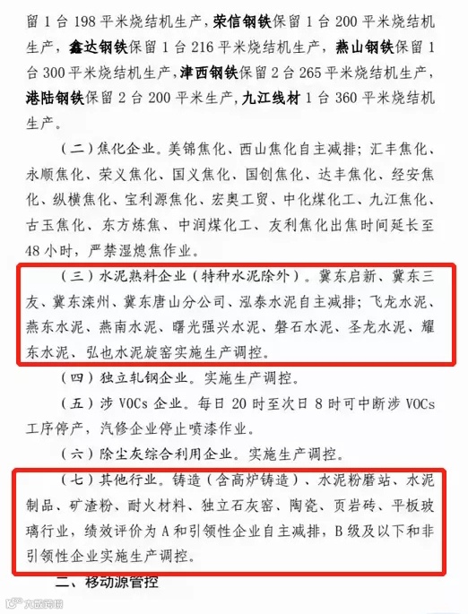 其中,水泥熟料企业(特种水泥除外)。冀东启新、冀东三友、冀东滦州、冀东唐山分公司、泓泰水泥自主减排;飞龙水泥、燕东水泥、燕南水泥、曙光强兴水泥、磐石水泥、圣龙水泥、耀东水泥、弘也水泥旋窑实施生产调控。