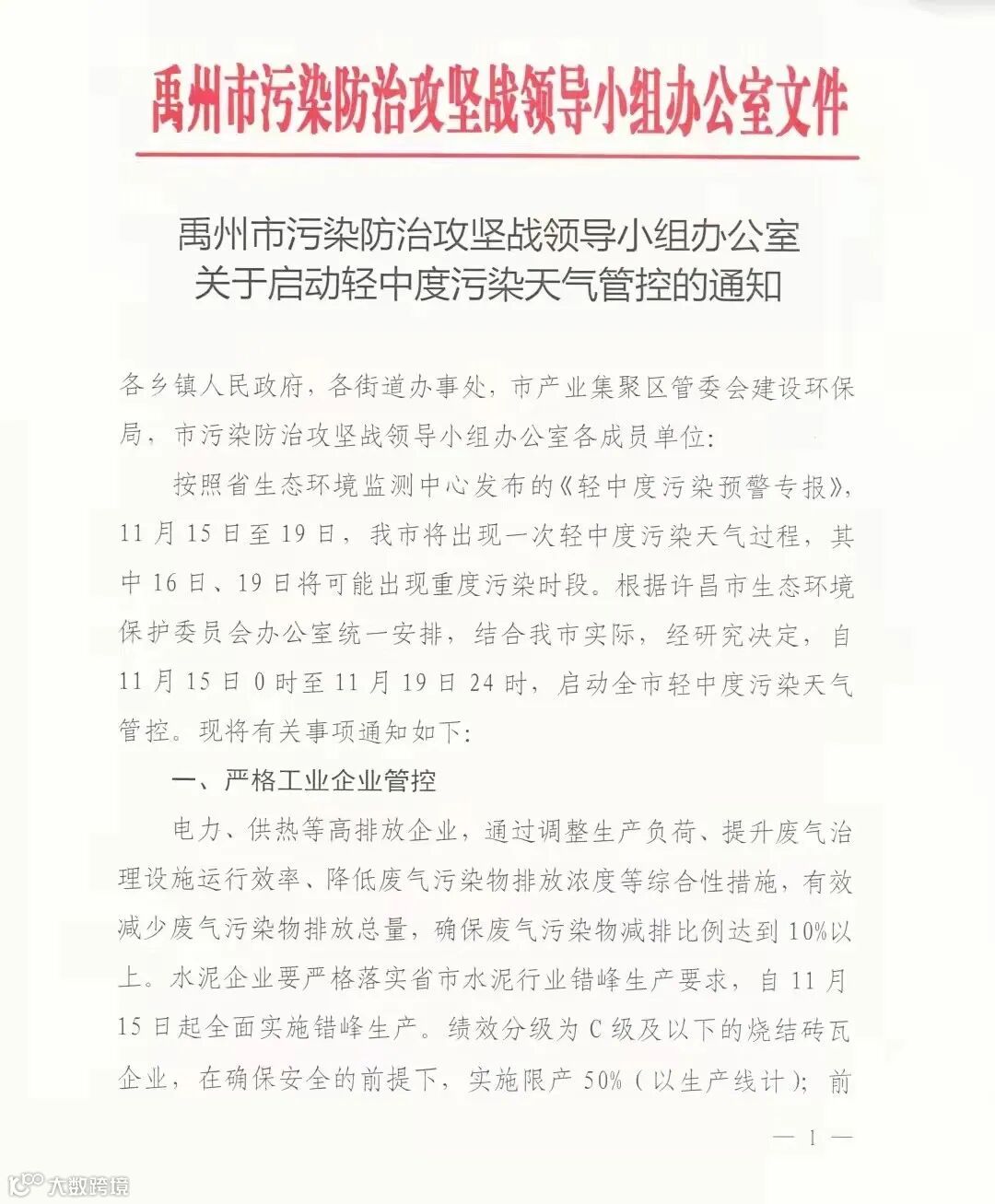 禹州市污染防治攻坚战领导小组办公室发布《关于启动轻中度污染天气管控的通知》,自11 月 15 日 0时至 11 月 19日 24 时,启动全市轻中度污染天气管控。