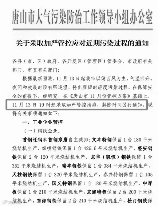11月13日,唐山市大气污染防治工作领导小组办公室发布关于采取加严管控应对近期污染过程的通知。要求在保障安全的前提下,经研究,在《唐山市11月份管控方案》基础上,11月13日19时起采取加严管控措施,解除时间另行通知。